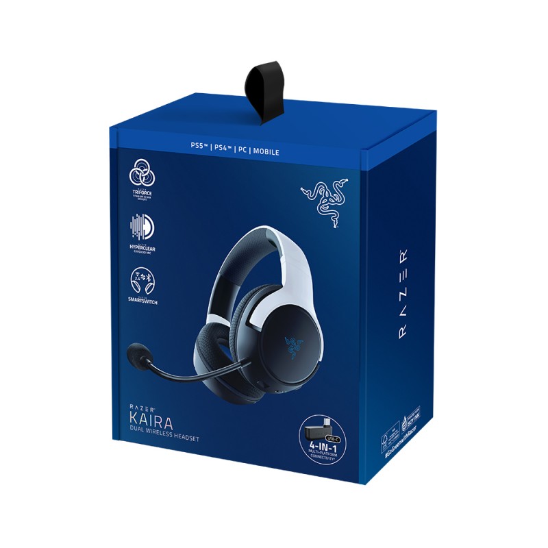 Razer Kaira for PlayStation — это беспроводные наушники для PlayStation с двумя вариантами подключения и технологией SmartSwitch. Устройство поддерживает радиочастотное соединение с диапазоном 2,4 ГГц и Bluetooth-технологию, а еще эта гарнитура прекрасно совместима со смартфонами.