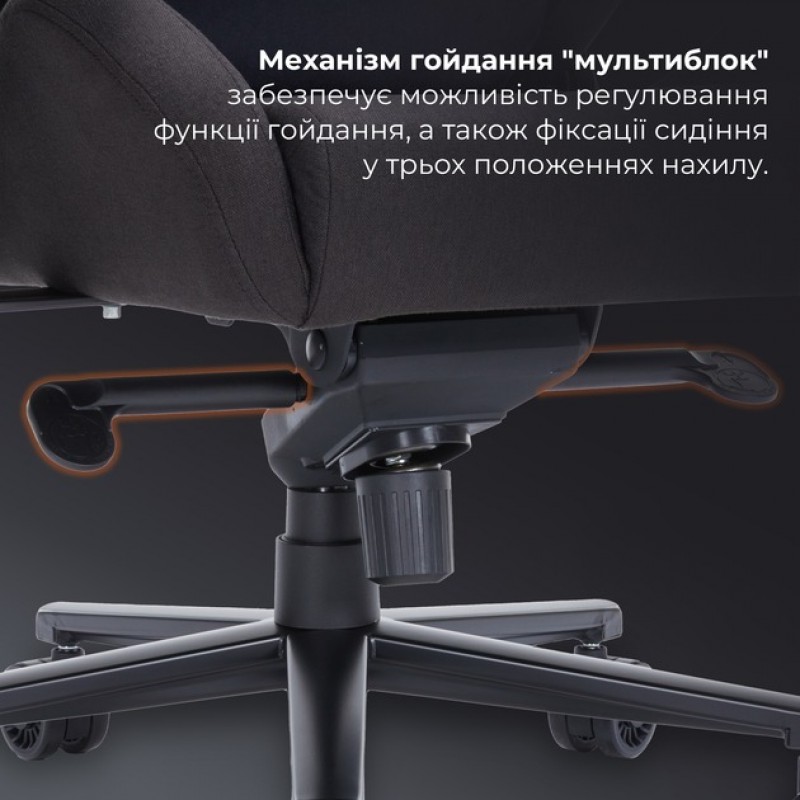 Механизм качания "мультиблок" обеспечивает возможность регулировки функции качания, а также фиксации сидения в трех положениях наклона. настройка вашего кресла. Металлическое основание и нейлоновые колеса увеличенного размера диаметром 75 мм гарантируют устойчивость и плавное движение.