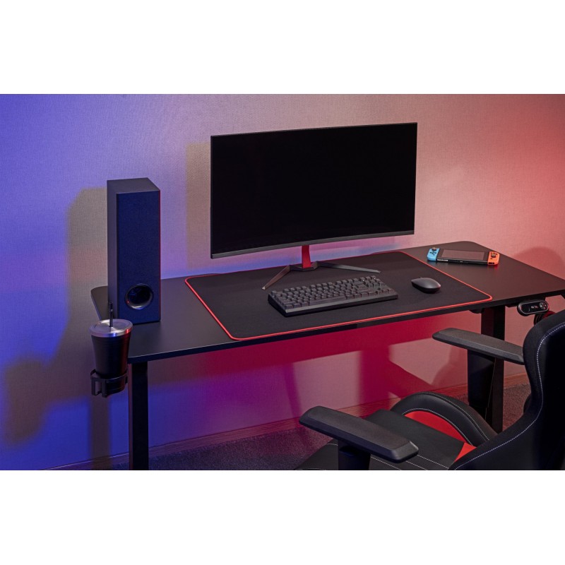 Модель имеет эргономичный изгиб спереди для удобной посадки и вырез для кронштейна сзади, благодаря чему вы сможете поставить стол непосредственно у стены. Столешница достаточно большая по размерам, поэтому места хватит, чтобы расположить все необходимые приборы, аксессуары и другие вещи. Однако для дополнительного комфорта и экономии места на рабочем столе ODE714 оснащен крючком для напитков и держателем для наушников. Также имеется двухцветный коврик, который улучшит скольжение мышки, защитит стол от царапин и оптимизирует работу.