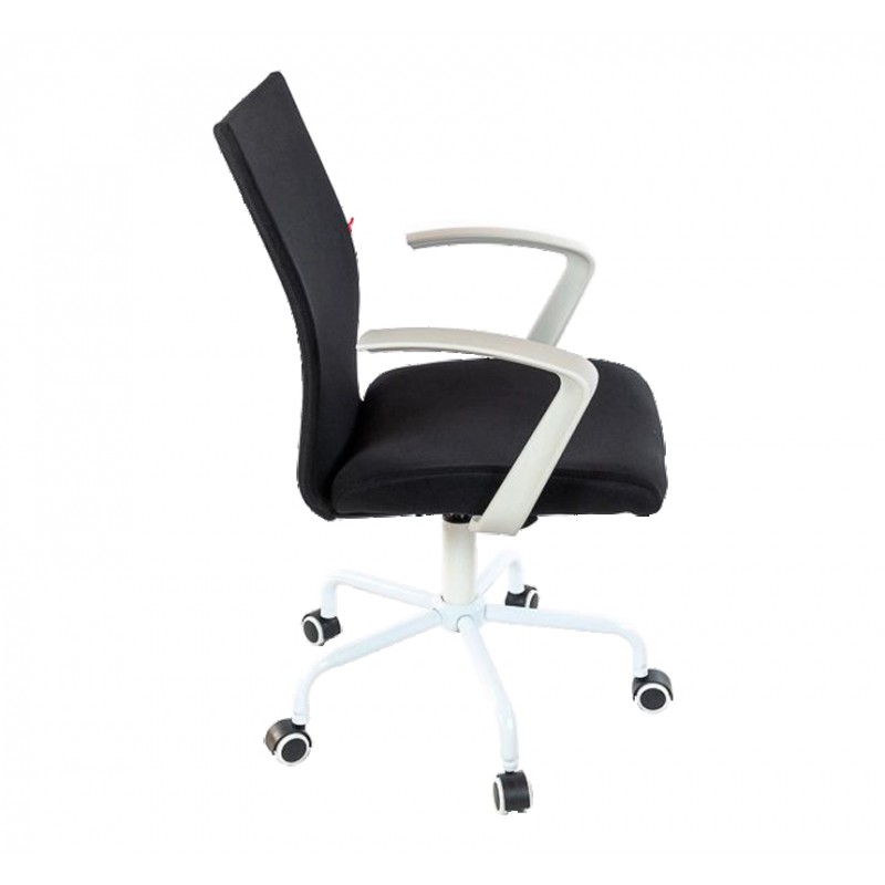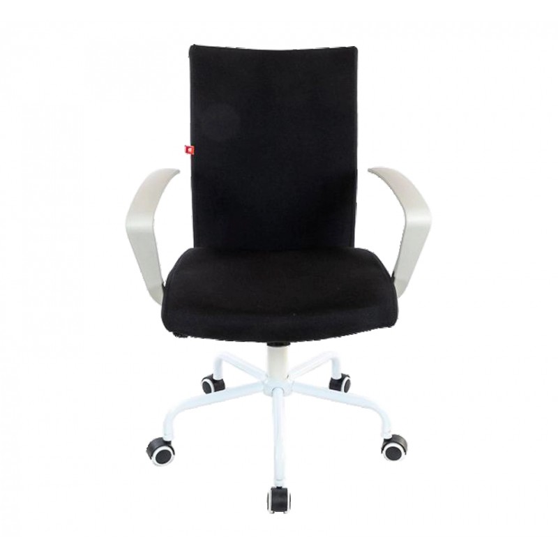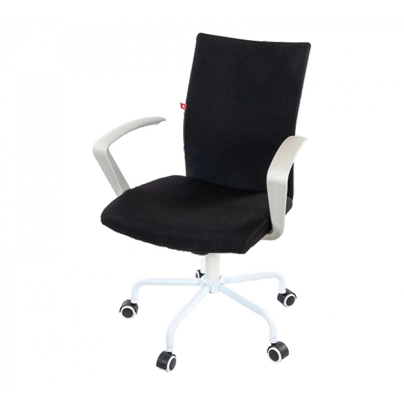 Кресло для персонала. Обладает компактными размерами, простым внешним видом, необычной формы крестовиной и подлокотниками, выполненными в одном цвете. Удобная эргономичная спинка имеет прогиб в поясничном участке, который обеспечит спине комфортную поддержку. Она тонкая, аккуратная и элегантная, имеет металлический каркас, на который натянута ткань. Обивкой служит яркая натуральная ткань. Углубления в центральной части сиденья и скошенный передний край формируют правильную и удобную посадку и обеспечат здоровье для ног.
