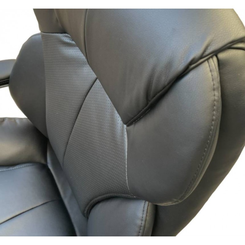 Обивка. Для кресла была выбрана универсальная обивка, а именно качественная экокожа. Этот материал практически не уступает своим качествам натуральной коже, а цена – это его основное преимущество. Он имеет натуральное основание и отлично зарекомендовал себя за годы использования в офисе. Экокожа – это современный, прочный материал, простой в уходе.