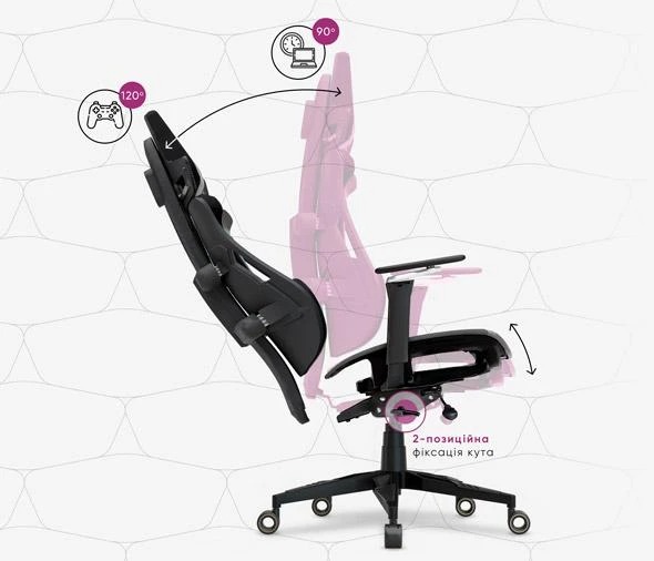 Благодаря синхромеханизму с двойной фиксацией можно регулировать наклон кресла, фиксируя спинку под углом 90° для сосредоточенной работы или 120° для максимально комфортного отдыха и игровых сессий.