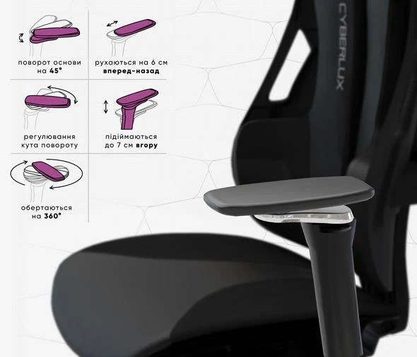 Регулируемые 5D подлокотники позволяют полностью адаптировать положение рук благодаря настройке высоты, глубины, угла наклона, повороту и вращению на 360°. Это обеспечивает комфортную поддержку и помогает снизить усталость мышц рук.