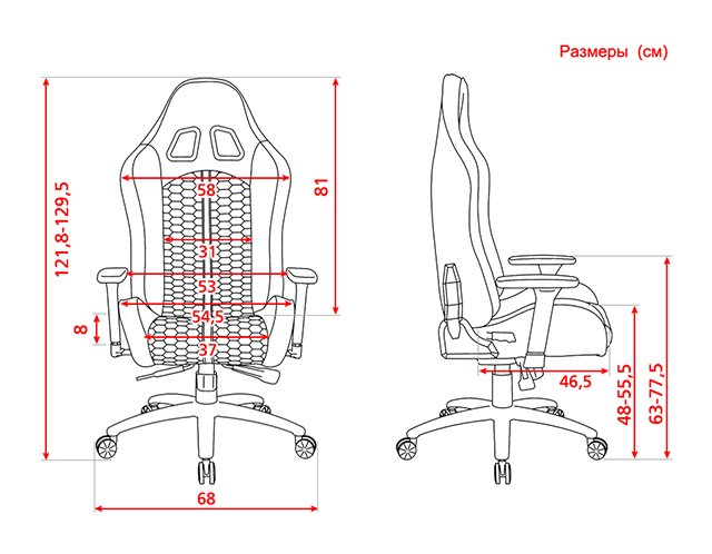 Размер сиденья: ширина 46,5 см., длина 54,5 см., высота 48-55 см.