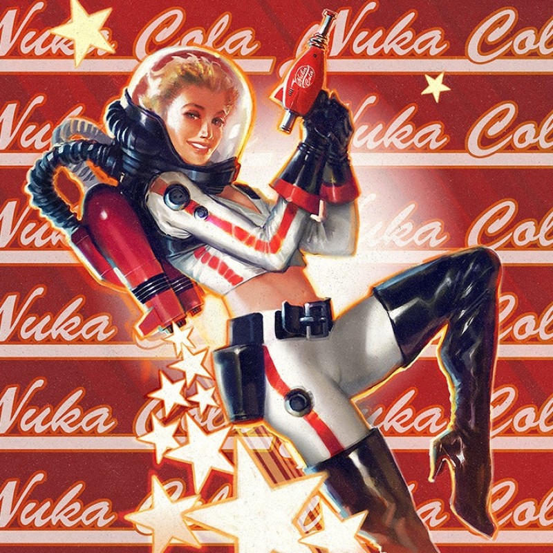 Передняя часть украшена стильной бутылкой и крышкой; красный фон с белыми бликами напоминает яркие рекламные щиты ядер-колы в Пустоши.