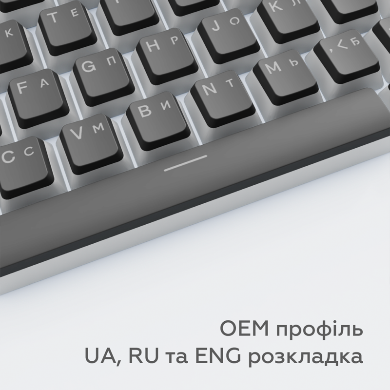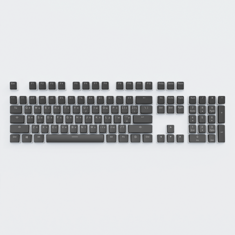 Износостойкие кейкапы PBT с верхним нанесением символов ENG/RU/UA.
